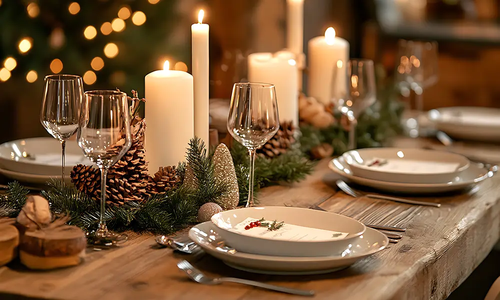 Guardanapos bem dobrados, talheres organizados em pequenas amarrações, sousplats discretos e taças com leve transparência elevam o visual sem exagero. São elementos que dão acabamento e ajudam a deixar a mesa mais elegante.